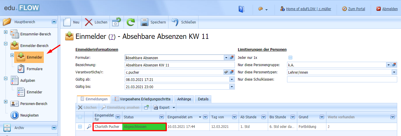 Im nächsten Schritt sieht die Direktorin und der Administrator unter „Einmeldungen“ die eingegangenen Einmeldungen.