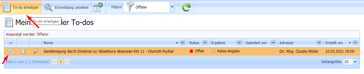 Die gewünschte Einmeldung wird ausgewählt und mit Klick auf „To-do erledigen“ von der Direktorin genehmigt.
