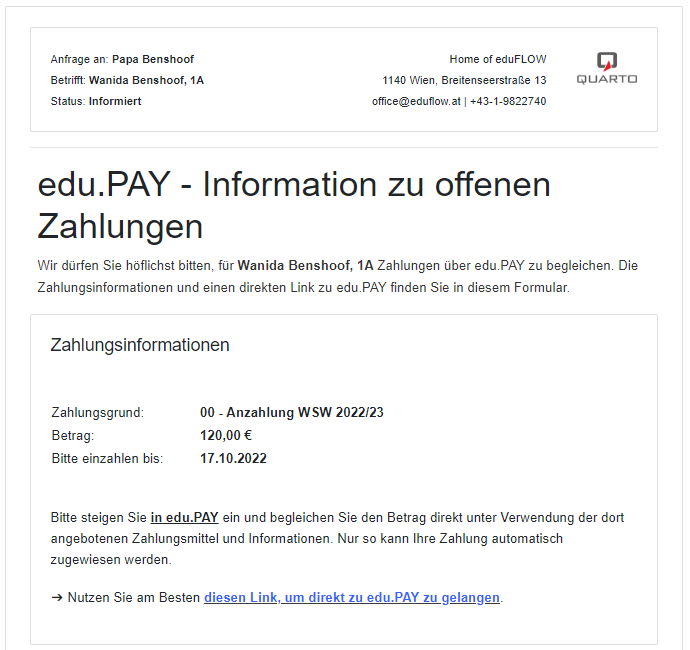 Im Formular finden die Adressaten die entsprechenden Informationen (Betrag, Titel, etc.), welche auch einen direkten Link zur Bezahlseite in edu.PAY beinhaltet. Die Zahlungen können dort direkt vorgenommen werden, ohne dass diese sich nochmals anmelden müssen.