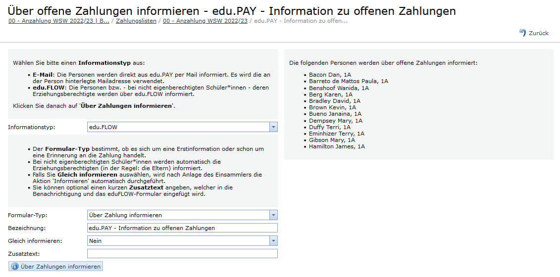 Zahlungsinformationen bzw. -erinnerungen können direkt in edu.PAY aus jeder Liste an Forderungen / offenen Zahlungen heraus durchgeführt werden:
