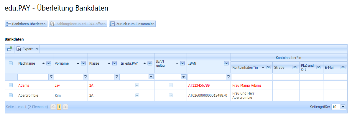 Rot gekennzeichnete Einträge weisen auf fehlede oder inkorrekte Daten hin. (Prüfsumme IBAN falsch, etc.)
