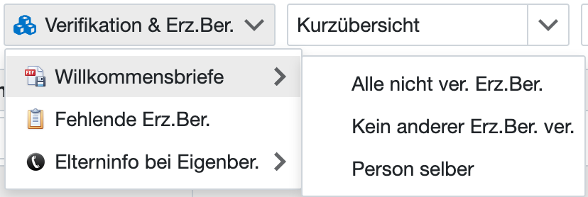 HINWEIS: Will man Briefe für Erziehungsberechtigte generieren, wählt man in der Personenliste nicht die Eltern-Personen selber, sondern die Schüler/innen aus. Über die Option „Kein anderer Erz.Ber. ver.“ und „Alle nicht ver. Erz.Ber.“ werden dann für die entsprechenden Erziehungsberechtigten die Willkommensbriefe generiert.