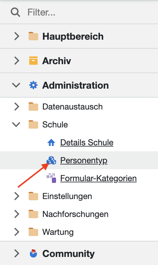 Schüler/innenLehrer/innenErziehungsberechtigte (meist „Eltern“)VerwaltungDiese Standardtypen finden Sie auch in den vordefinierten Filtern in den diversen Listen in edu.FLOW wieder. Darüber hinaus können Sie jederzeit weitere Typen (wie 'Direktion' etc.) definieren und Personen diesen Typen zuordnen.
