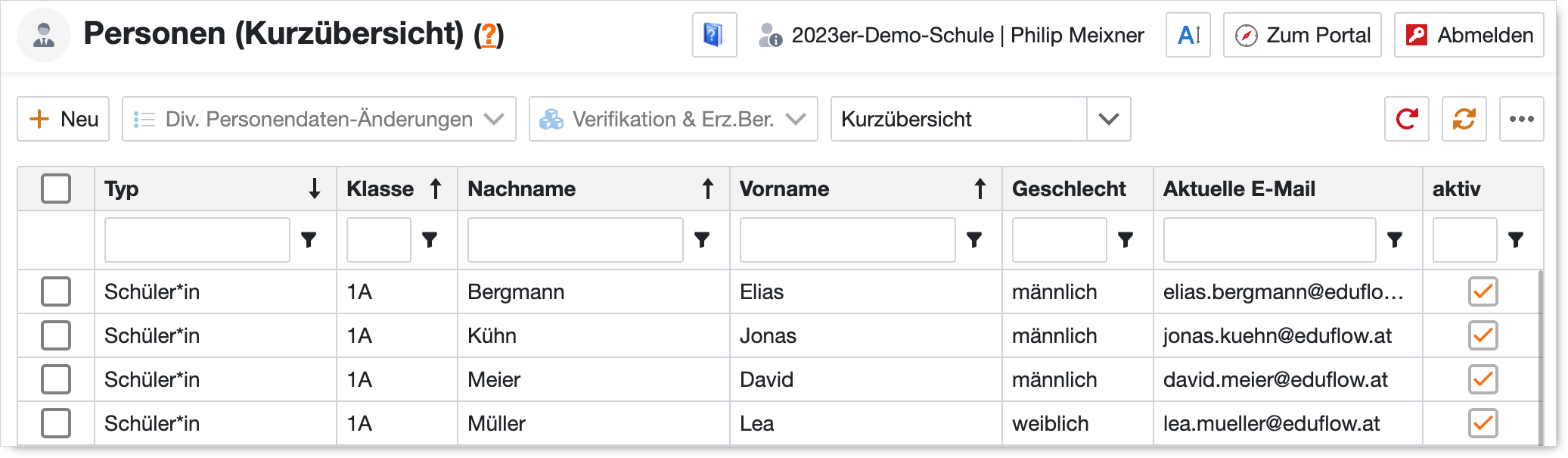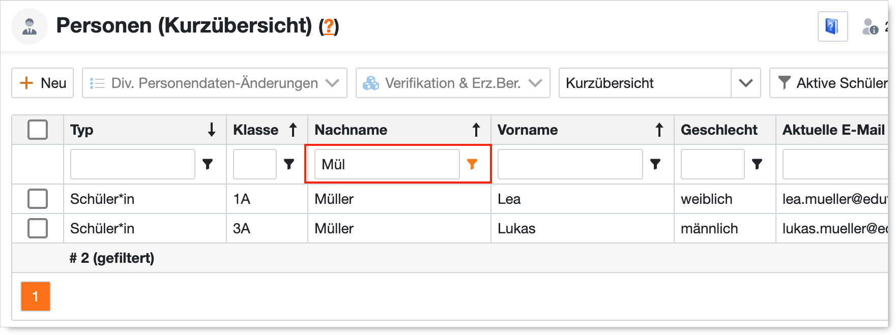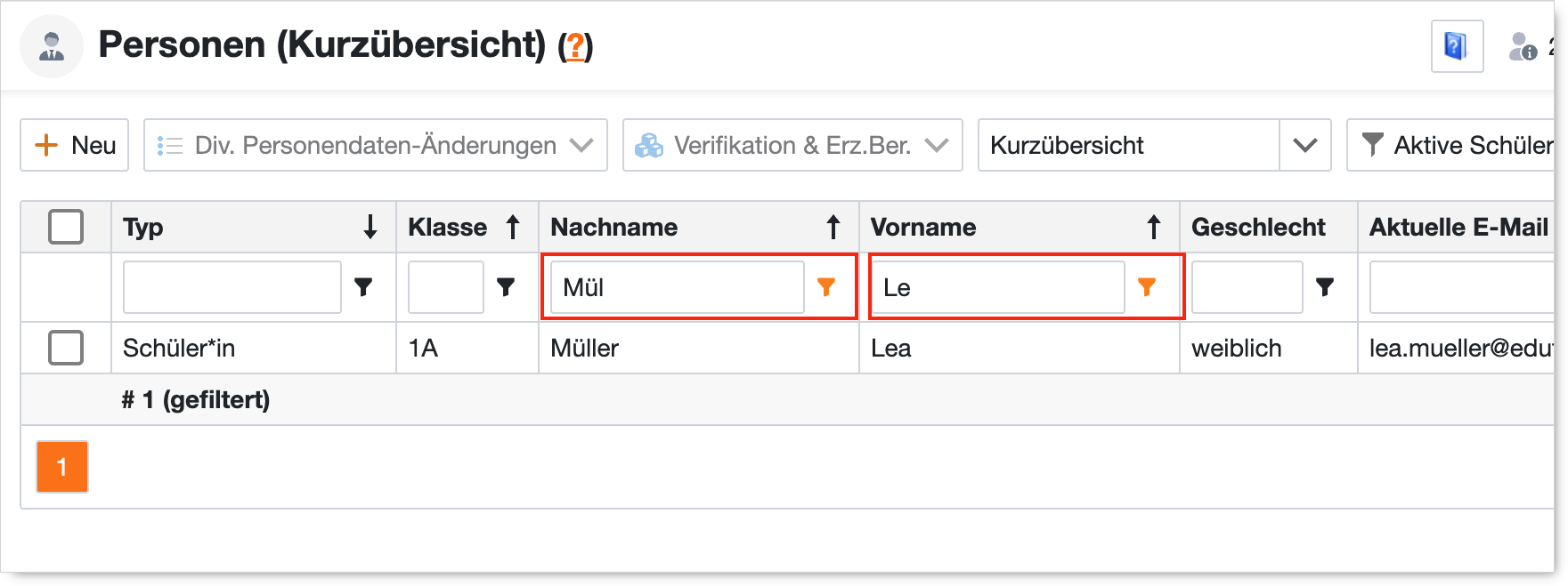 In der Personenliste können Sie mehrere Suchfelder gleichzeitig nutzen, z. B. Nachname und Vorname: