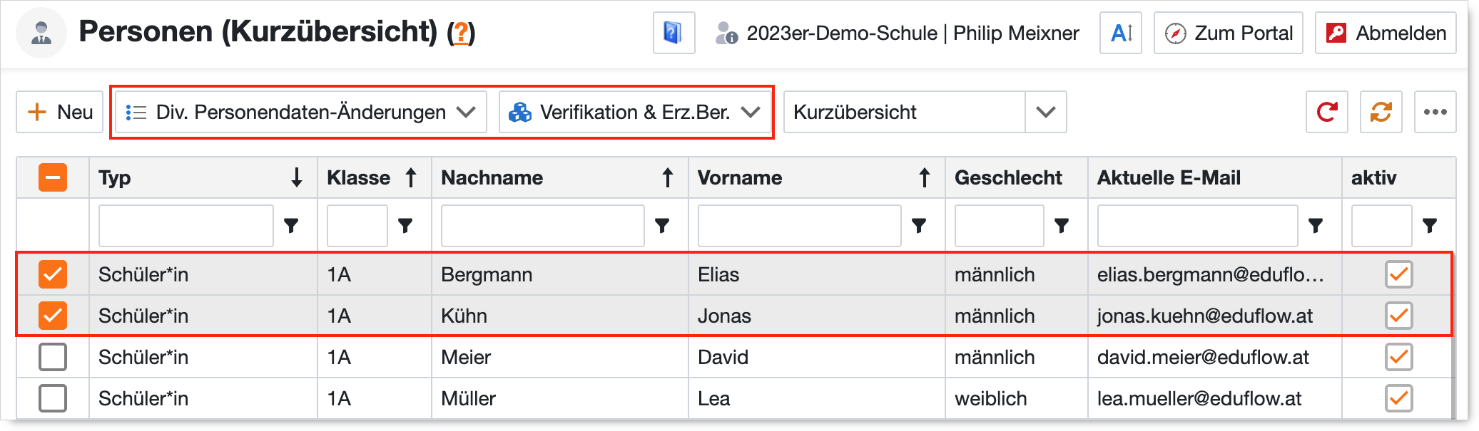 Ausgewählte Einträge werden orange hinterlegt und die Aktionsbuttons der Liste werden aktiviert. Die verfügbaren Buttons unterscheiden sich je nach Liste. Im Beispiel sehen Sie die Personenliste: