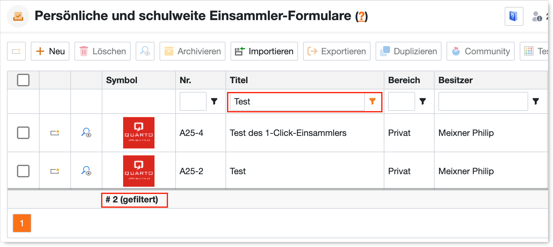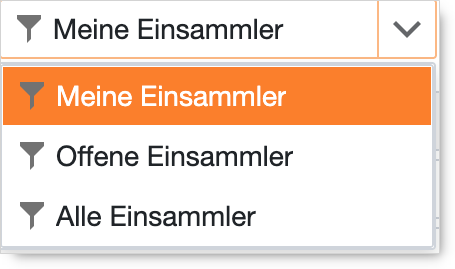 Die Listen Personen, Einsammler, Formulare und Benutzer verfügen über vordefinierte Filter, die je nach Listeninhalt variieren.