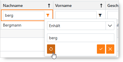 Gefilterte, sortierte oder in der Seitengröße veränderte Listen können durch Klick auf die entsprechende Aktion rechts oben zurücksetzen wieder auf den Ausgangszustand gebracht werden.