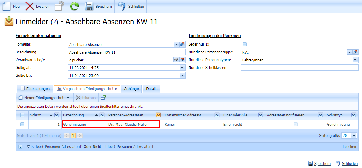 Im Fenster „Genehmigung – Einmelder-Erledigungsschritt“ ist nun die hinzugefügte Person, die Direktorin, sichtbar.