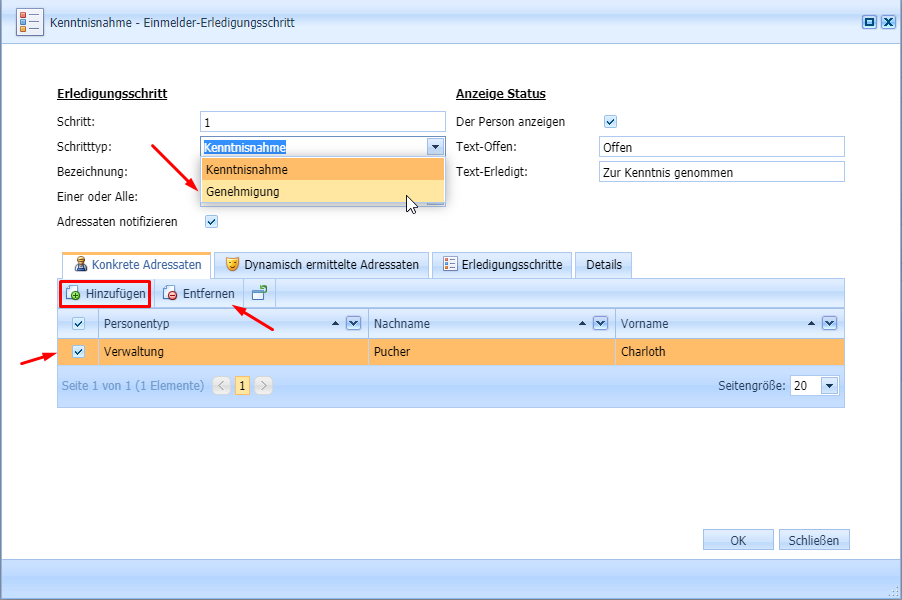 Im unteren Teil fügt er nun einen „neuen Erledigungsschritt“ hinzu. Standardmäßig ist der erste Erledigungsschritt eine „Kenntnisnahme“. Diesen ändert er nun auf „Genehmigung“, da Absenzen zuerst von der Direktion genehmigt werden sollen. Er wählt dazu die „Kenntnisnahme“ aus und ändert den Schritttyp auf „Genehmigung“. Danach entfernt er die vorausgefüllte Person und fügt nun den gewünschten Adressaten hinzugefügt, in diesem Fall die Direktorin.