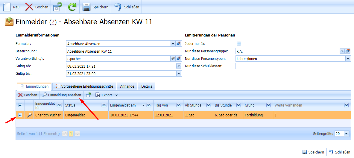 Im nächsten Schritt sieht die Direktorin und der Administrator unter „Einmeldungen“ die eingegangenen Einmeldungen.