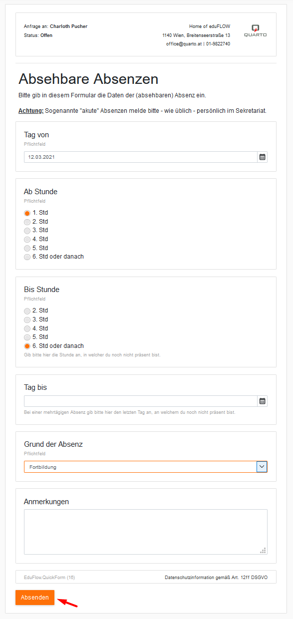 Sogenannte „Absehbare Absenzen“ werden aktuell an vielen Schule über Formulare in Papierform administrativ verwaltet. An einer bestimmten Schule könnte dies konkret etwa so ablaufen: