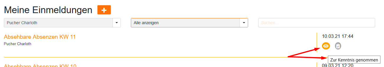 Unter „Meinen Einmeldungen“ findet die Lehrerin alle ihre bisherigen Einmeldungen. Sie klickt auf das „+“ Zeichen, um sich die Liste der für sie vorgesehenen Einmelder anzeigen zu lassen.