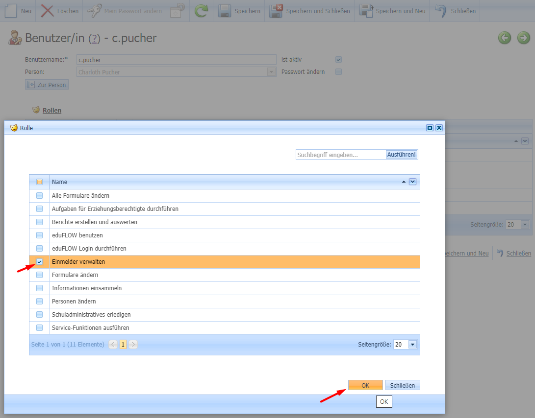 Dem/der Benutzer/in wurde nun die Rolle „Einmelder verwalten“ zugewiesen, siehe Abbildung.