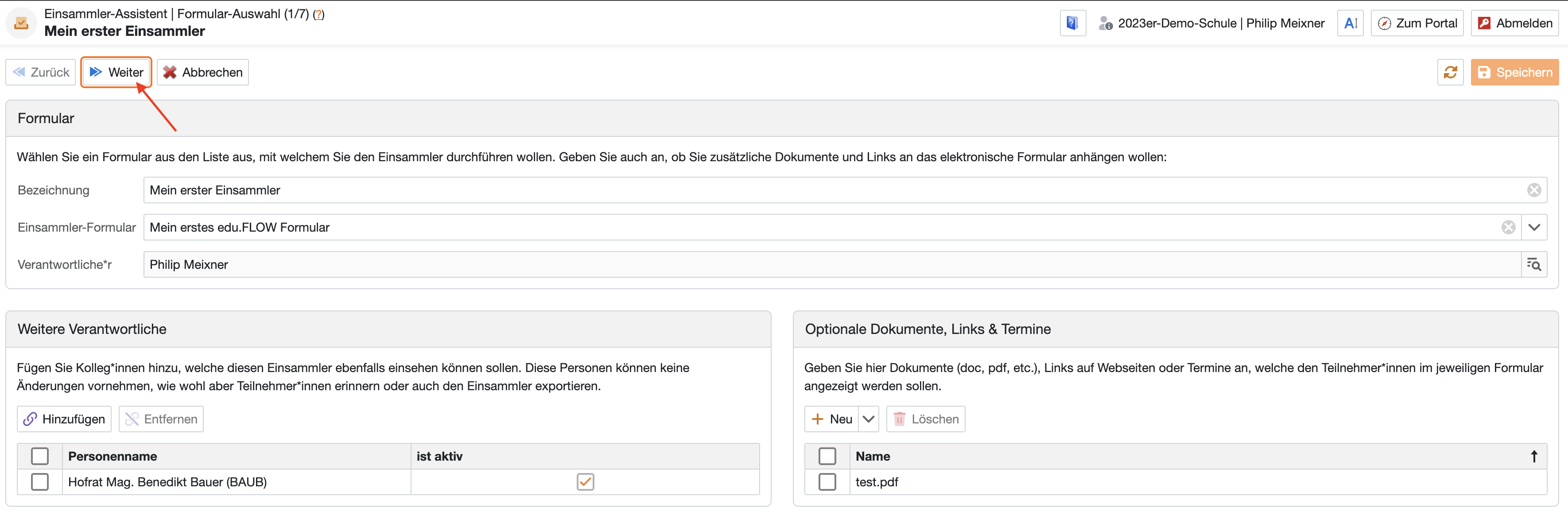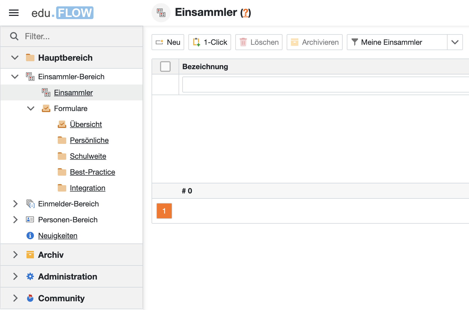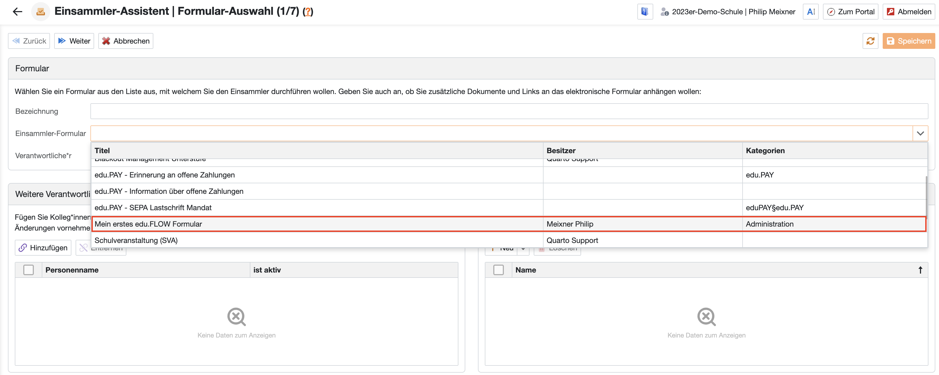 HINWEIS: Geben Sie einfach ein kurzes Wort in das Feld „Einsammler-Formular“ ein. edu.FLOW filtert automatisch jene Formulare, welche dieses Wort im Namen enthalten haben.