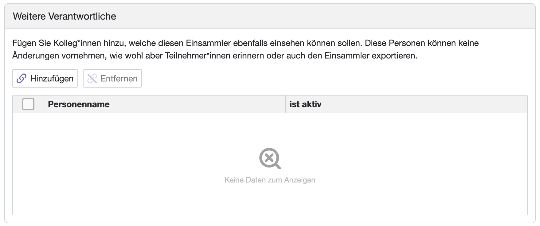 Standardmäßig ist immer der Ersteller eines Einsammlers für diesen verantwortlich; der Einsammler wird in der Übersicht unter 'Meine Einsammler' angezeigt. Soll er mehreren Personen - oder auch allen Mitgliedern einer Personengruppe - zugänglich sein, haken Sie unter 'Verantwortliche' die Auswahl 'Weitere anz.?' an, und fügen Sie einzelne Personen bzw. Personengruppen hinzu. Diese Personen können den Einsammler öffnen, einsehen exportieren und ggf. Personen erinnern, ihn jedoch nicht ändern.