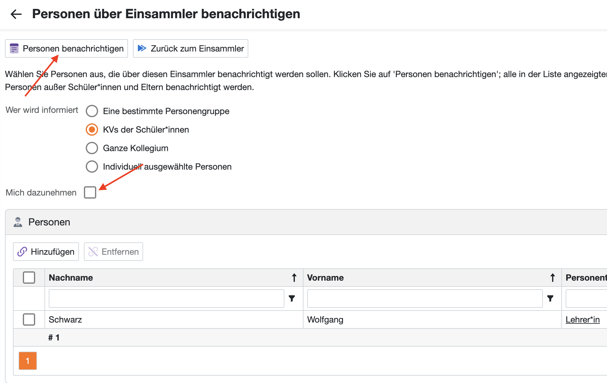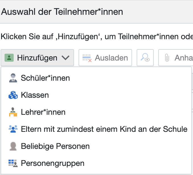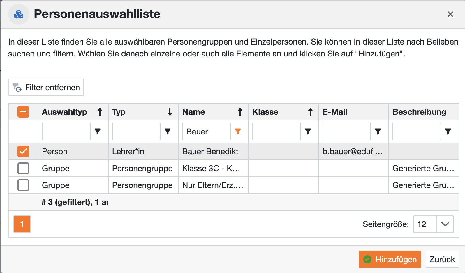 Ebenfalls können Sie beliebige Personen (keine Schüler*innen und Eltern) hinzufügen oder entfernen. Beachten Sie: Sobald Sie die Auswahl oben ändern, werden alle einzeln hinzugefügten Personen wieder aus der Liste entfernt.