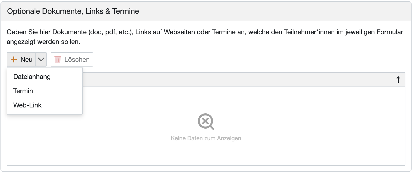 Falls Sie zusätzlich zum Inhalt des Formulars noch weitere Informationen wie etwa Dokumente oder Web-Links den Teilnehmern zugänglich machen wollen, wählen Sie „Dokumente und Links anhängen“.