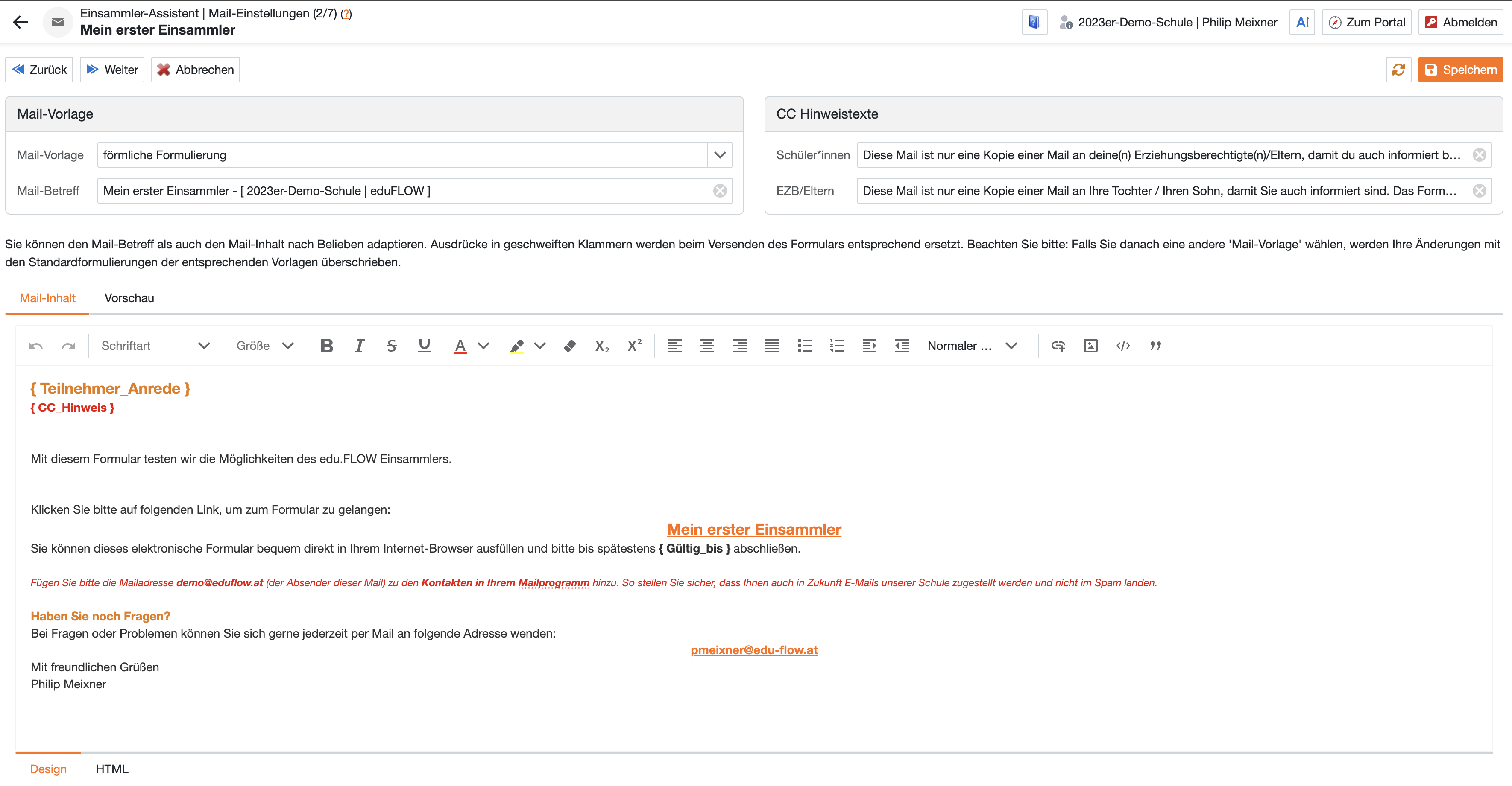 In diesem Schritt wird Ihnen gezeigt, wie die E-Mail, welche die Teilnehmer jeweils zu ihrem personalisierten elektronischen Formular führen wird, aussieht. Wählen Sie die Art der Formulierung aus. Mail-Betreff sowie der Mail-Text sind editierbar.