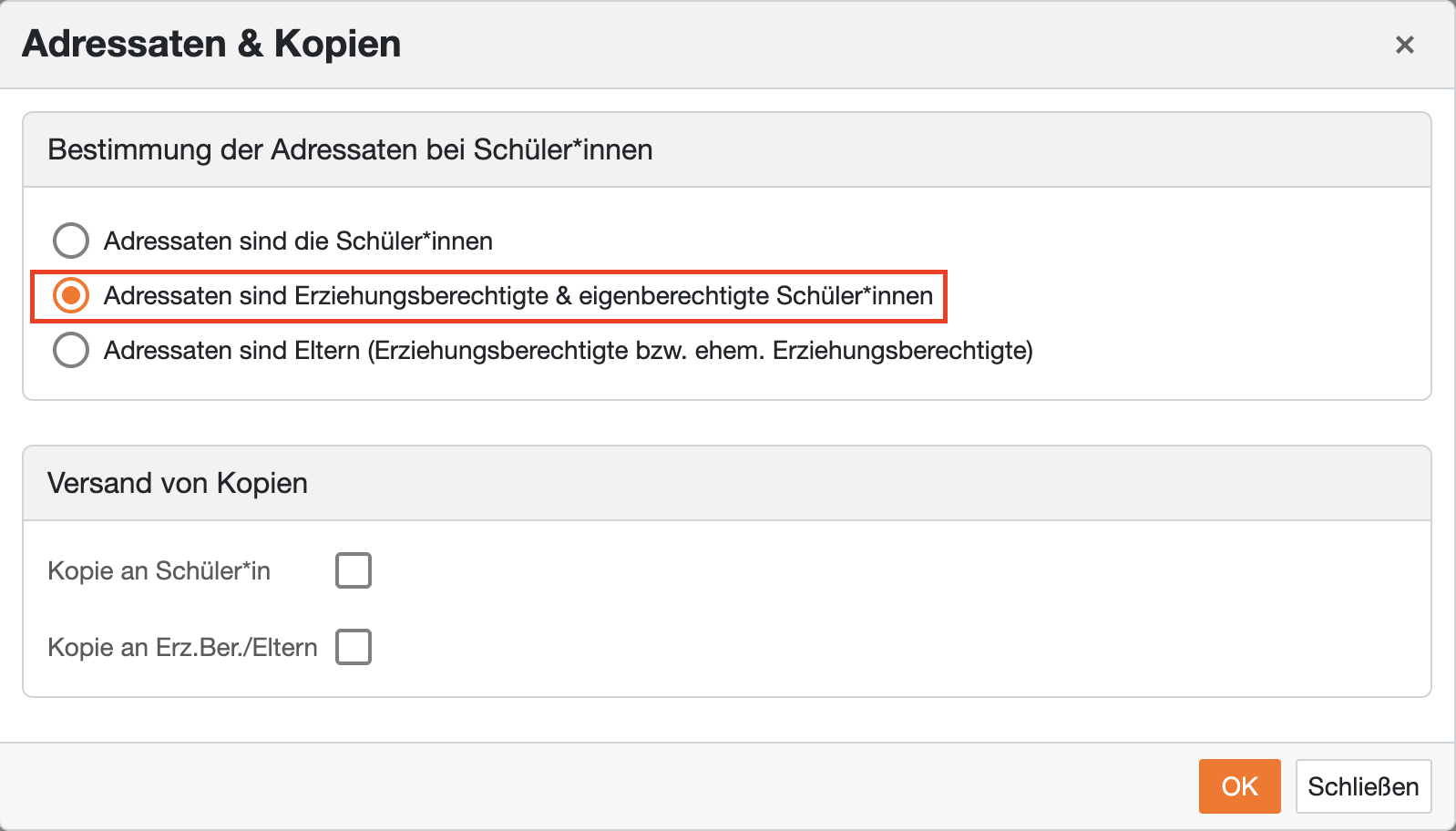 HINWEIS: Ist ein/e Schüler*in schon eigenberechtigt, ist es trotzdem noch möglich and die (ehemals) Erziehungsberechtigten / Eltern eine Kopie zu senden. Allerdings nur dann, wenn bei der Schülerin / dem Schüler die Einstellung "Keine Elterninfo" nicht aktiviert ist.