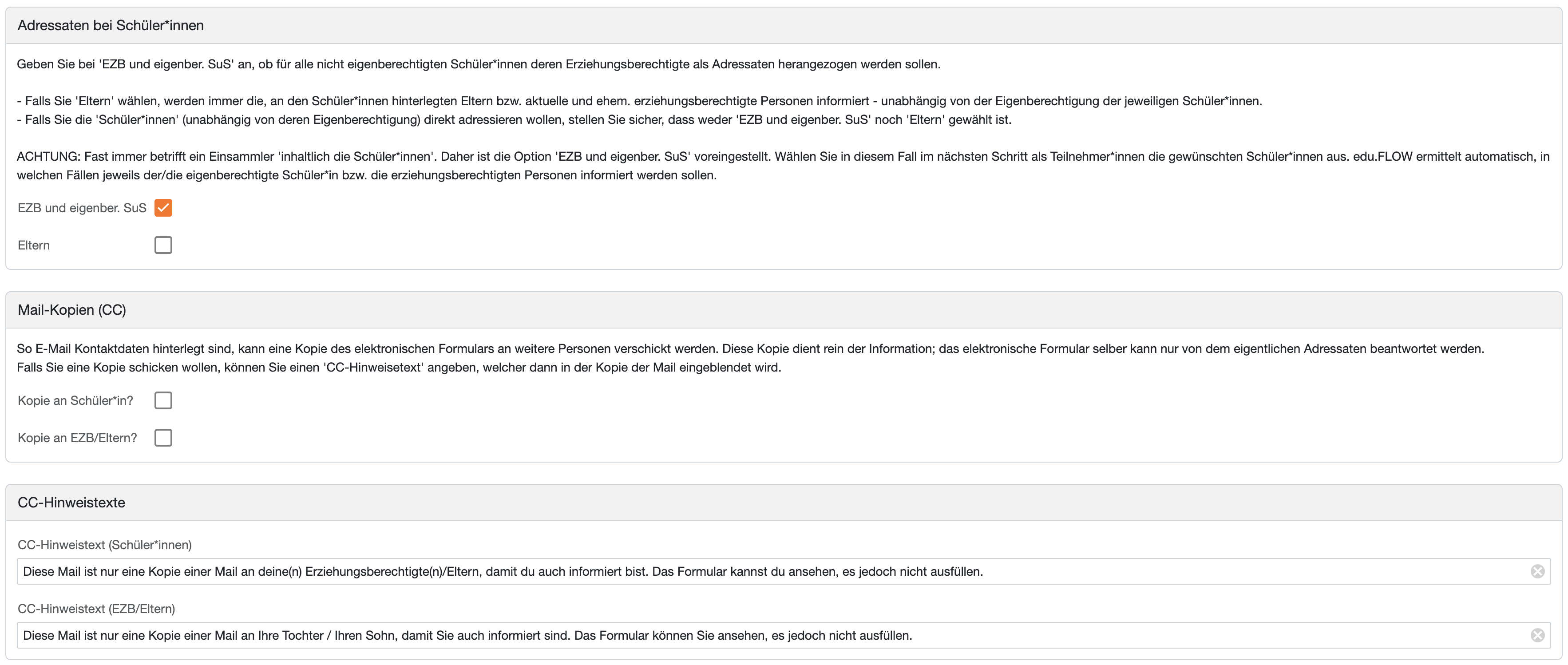Meistens betreffen Einsammler (inhaltlich) die Schüler*innen. Falls diese jedoch nicht eigenberechtigt sind, müssen die Eltern bzw. Erziehungsberechtigten adressiert werden. Wählen Sie in diesem Fall die (voreingestellte) Auswahl Erziehungsberechtigte und eigenberechtigte Schüler*innen und im nächsten Schritt als Teilnehmer*innen die gewünschten Schüler*innen aus. edu.FLOW ermittelt automatisch, in welchen Fällen jeweils der/die eigenberechtigte Schüler*in bzw. die erziehungsberechtigten Personen informiert werden sollen.