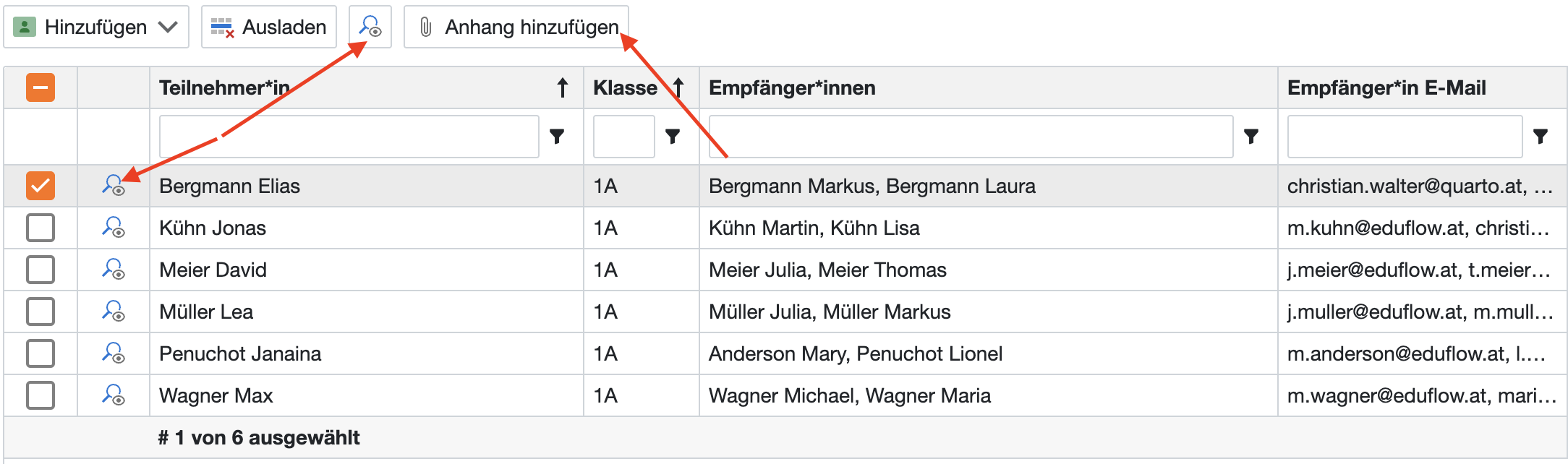 Über die mit dem Pfeil angezeigte Schaltfläche können Sie sich anzeigen lassen wie das Formular für den jeweiligen Schüler aussehen wird.