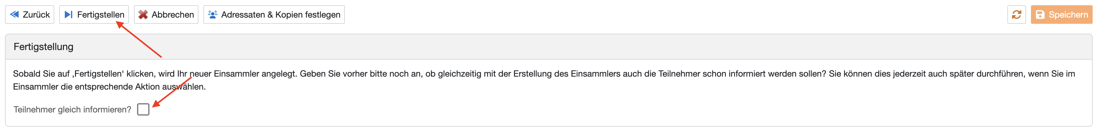 Sie können mit Fertigstellung des Assistenten die Teilnehmer gleich informieren lassen. Falls Sie dies noch nicht tun möchten, selektieren sie die Checkbox neben „Teilnehmer gleich informieren?“ nicht und klicken Sie auf „Fertigstellen“.
