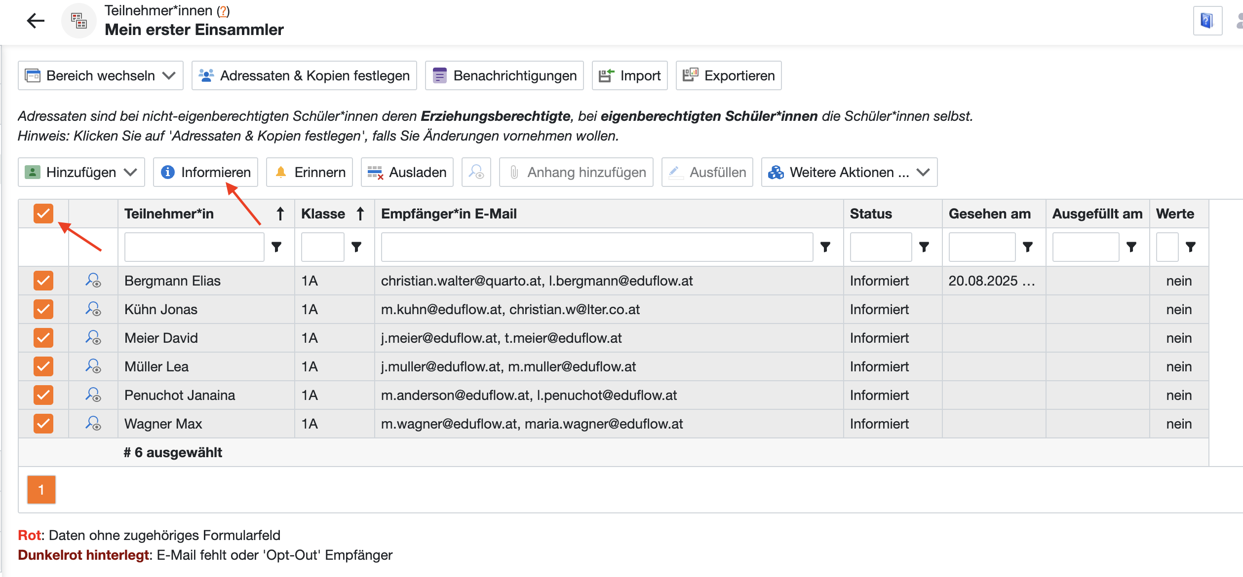 Jetzt können Sie alle Teilnehmer des Einsammlers Informieren. Dazu wählen Sie alle Teilnehmer*innen aus und klicken auf Informieren.