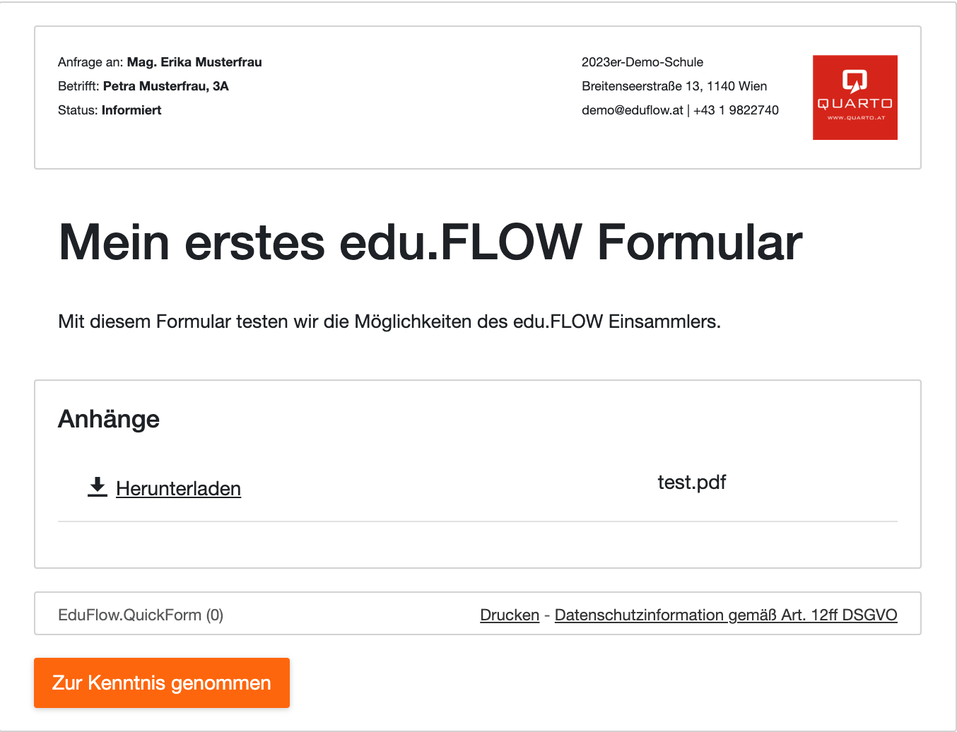 An die Personen wird eine Mail geschickt, welche einen Link auf das Formular des Einsammlers gefüllt mit Beispieldaten enthält. Etwaige Anhänge des Formulars und des Einsammlers werden angezeigt und können heruntergeladen werden.
