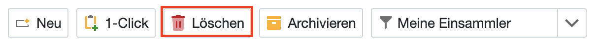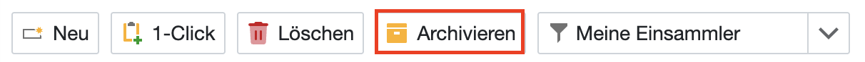 Im Laufe der Zeit sammeln sich viele Einsammler in dieser Liste. Um den Überblick zu bewahren, archivieren Sie einen oder mehrere Einsammler, indem Sie sie markieren und auf das 'Archiv' Symbol klicken. Die Einsammler werden aus dieser Liste in den Bereich 'Archiv → Archiv.Einsammler' verschoben. Dort können sie jederzeit angesehen und auch wieder reaktiviert werden. Mehr Infos dazu finden Sie unter archivierte Einsammler.