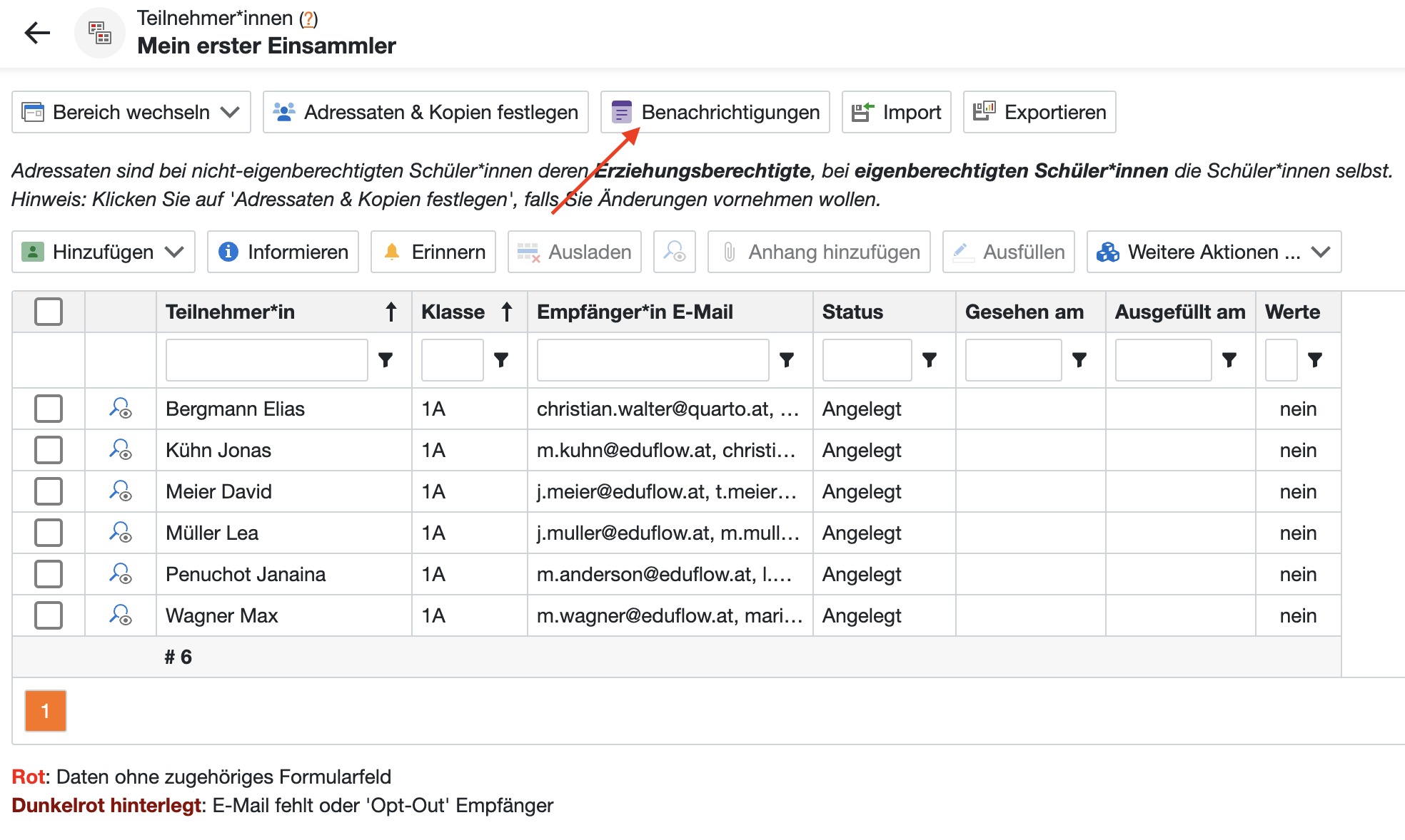 Manchmal möchte man bestimmte Personen über einen Einsammler bzw. über den Inhalt des Formulars informieren. Über die Aktion Benachrichtigen können Sie auswählen, an welche Personen (Schüler*innen und Eltern sind ausgenommen) diese Information geschickt werden soll. edu.FLOW schickt an diese eine Informations-Mail mit Link auf das Formular.