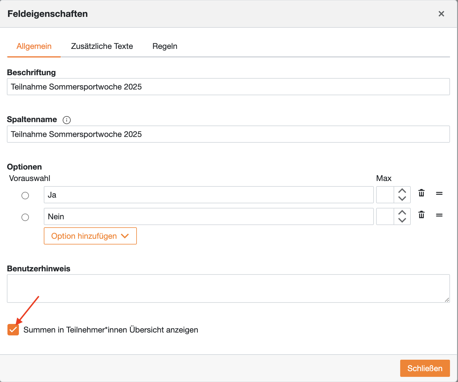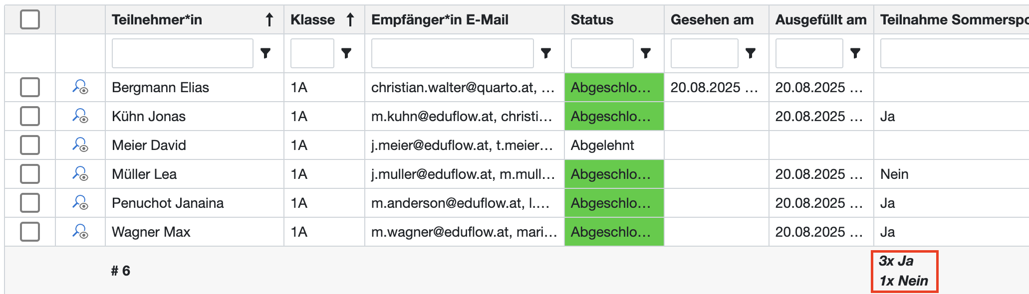 Wenn Ihr Formular eine Auswahlliste, ein Optionsfeld oder ein Markierfeld enthält, werden die Rückmeldung der einzelnen Schüler*innen in der in den Feldeigenschaften festgelegten Spalte (Spaltenname) angezeigt. Ist im entsprechenden Formularfeld die Option Summen in Teilnehmer*innen Übersicht anzeigen aktiviert, können Sie in der Fußzeile auf einen Blick abgelesen, wie viele Teilnehmer*innen welche Option gewählt haben.
