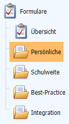 | Formulare | Formulare können nun zusätzlich auch in persönlichen und schulweiten Ordnern organisiert werden. Unter Best-Practice finden sich Formulare zu verschiedenen Themen, welche sich im Laufe der Jahre an den unterschiedlichen Schulen bewährt haben. Diese können - ähnlich den Community-Formularen - in den eigenen Formularbereich übernommen, dort adaptiert und verwendet werden. | Formulare in Ordnern organisieren | 23.1.5 |
