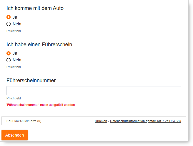Klicken Sie in der angezeigten Vorschau bei „Ich komme mit dem Auto“ abwechselnd auf „Ja“ und „Nein“. Das Feld „Führerscheinnummer“ wir ein- bzw. ausgeblendet.