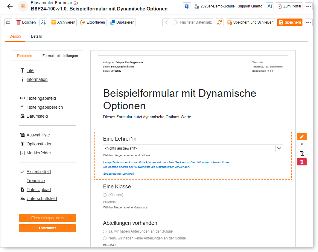 Der Formular Designer in edu.FLOW ermöglicht die einfache Erstellung und Anpassung von Formularen für verschiedene Anwendungsbereiche. Mit ihm können Eingabefelder, Auswahllisten und weitere Elemente flexibel zusammengestellt werden, um Prozesse wie Anträge, Abfragen oder interne Workflows digital abzubilden.