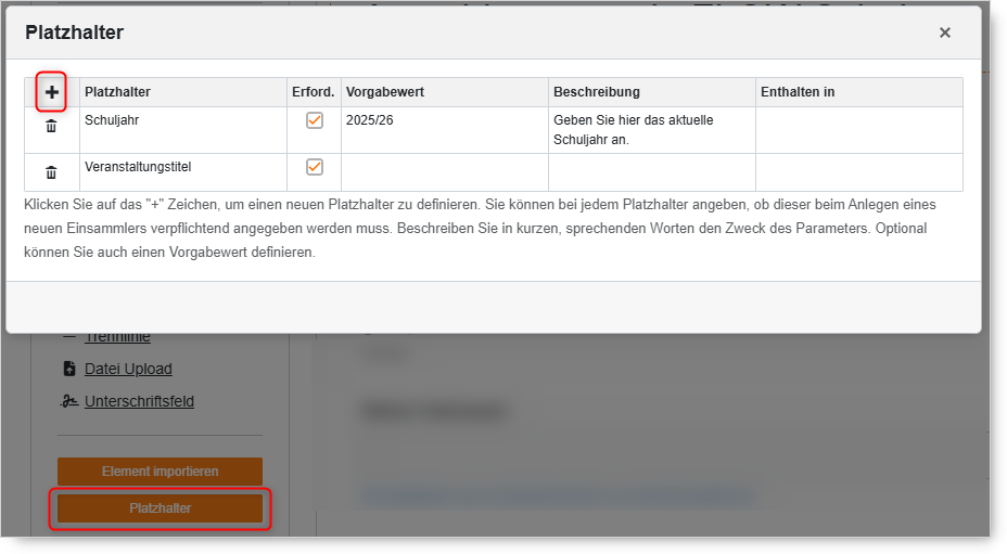 Ein Platzhalter wird definiert, indem Sie im Menü „Elemente“ die Aktion Platzhalter wählen; mit „+“ legen Sie einen neuen Platzhalter an. Im folgenden Beispiel sind {Schuljahr} und {Veranstaltungstitel} Platzhalter.