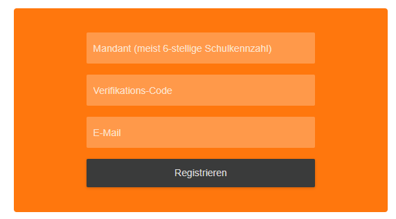 Geben Sie Mandant und Verifikations-Code wie im Willkommensbrief angegeben sowie Ihre Mail-Adresse ein und klicken Sie auf „Registrieren“.