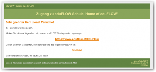 Sie erhalten nun eine weitere Mail mit Ihrem Passwort für die Anmeldung (siehe Beispiel unten). Sie können das Passwort später jederzeit ändern. Hilfe zum Passwort ändern finden Sie hier.