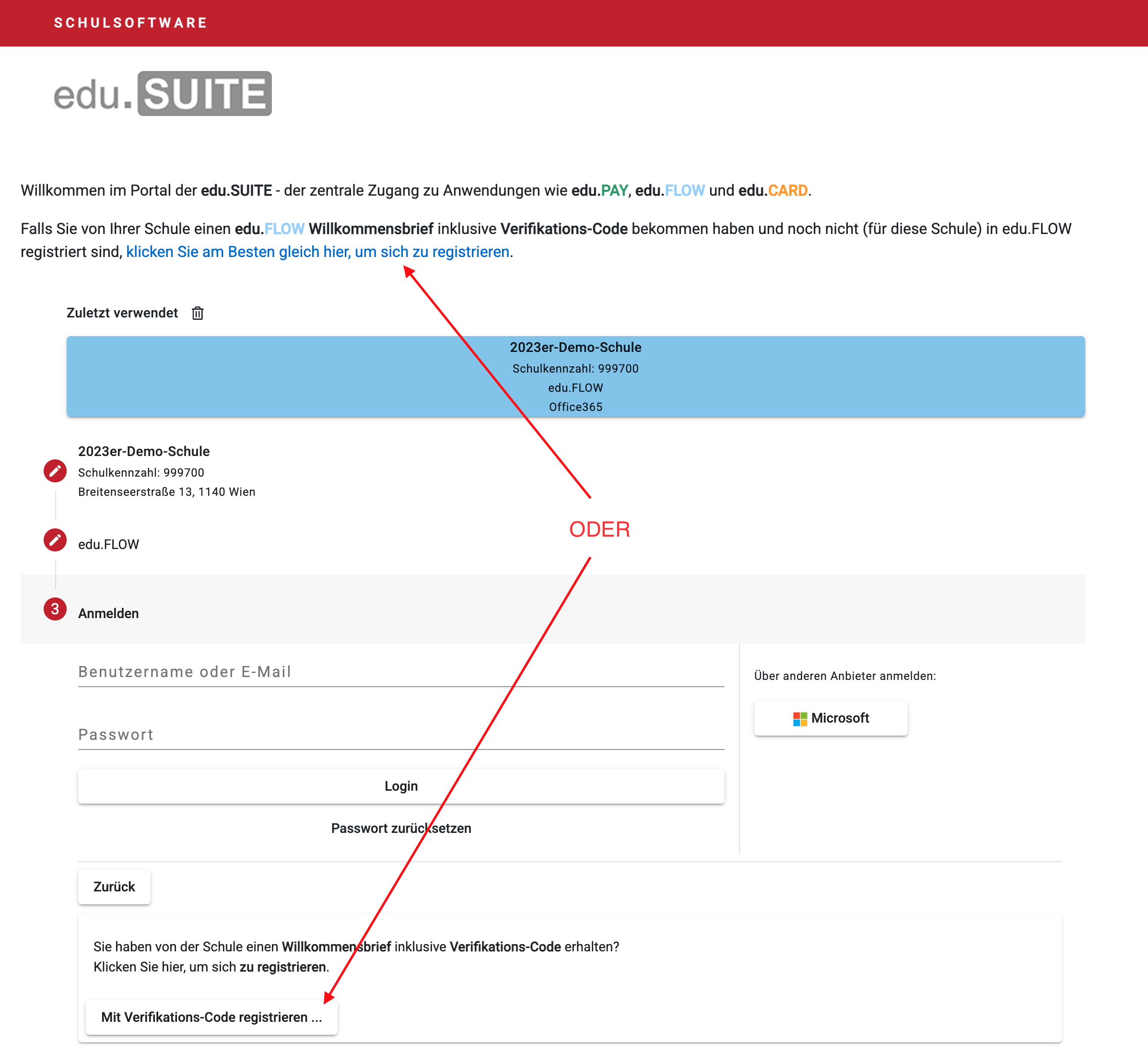 –> Falls Sie sich bereits für genau diese Schule in der Vergangenheit registriert haben - etwa für ein Geschwisterkind, welches die Schule besucht bzw. besucht hat - müssen Sie sich nicht nochmals registrieren. Melden Sie sich stattdessen in edu.FLOW an und fügen Sie mit dem Verifikations-Code das „neue“ Kind hinzu.